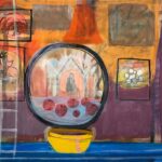 Das ist ein Osterbild, ein Frühlingsbild. Es zeigt den gleichzeitigen Moment von Verzweiflung und Hoffnung. Die Symbole dafür sind die Glocke, der kleine Altar mit Maria und dem Kind, die Kerze, die Eier, das Gitter. Das riesige Herz hinter einer kleinen Gestalt und die Blutkanäle formen einen Regenbogen. Im Vordergrund ist das Alltägliche: Äpfel, ein Tisch mit einer gelben Plastikschüssel, die mit Wasser gefüllt ist. Hier soll alles Emotionale und Schmerzende gekühlt und besänftigt werden. Die Äpfel sind Symbole für Gesundheit und Stärkung, deshalb sind sie mit dem Altar im Mittelpunkt des Bildes, der gleichzeitig ein Spiegel ist, der die getrennten Welten verbindet.