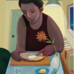 Begebenheiten, Sachverhalte, Vorgänge, Objekte – vieles Nebensächliche drängt nach immer mehr Bedeutung und Aufmerksamkeit und wird großgeredet und wichtig-geliked. Eine Hierarchie der Bedeutsamkeit lässt sich vor allem in politischen und gesellschaftlichen Zusammenhängen kaum noch ausmachen. In meinem Bild „Gib uns heute“ lasse ich den Protagonisten mit ganz existenziellen Themen allein, Themen die uns als Grundpfeiler einer zeitlosen Gesellschaft dienen könnten, deren Begriffe in jedem Regierungsgebäude eingemeißelt stehen sollten: Obdach, Natur, Kultur, Kleidung, Nahrung – grundlegende, menschliche Bedürfnisse, die keinen Aufschub dulden, oder an Bedingungen scheitern dürfen. Gib uns heute…