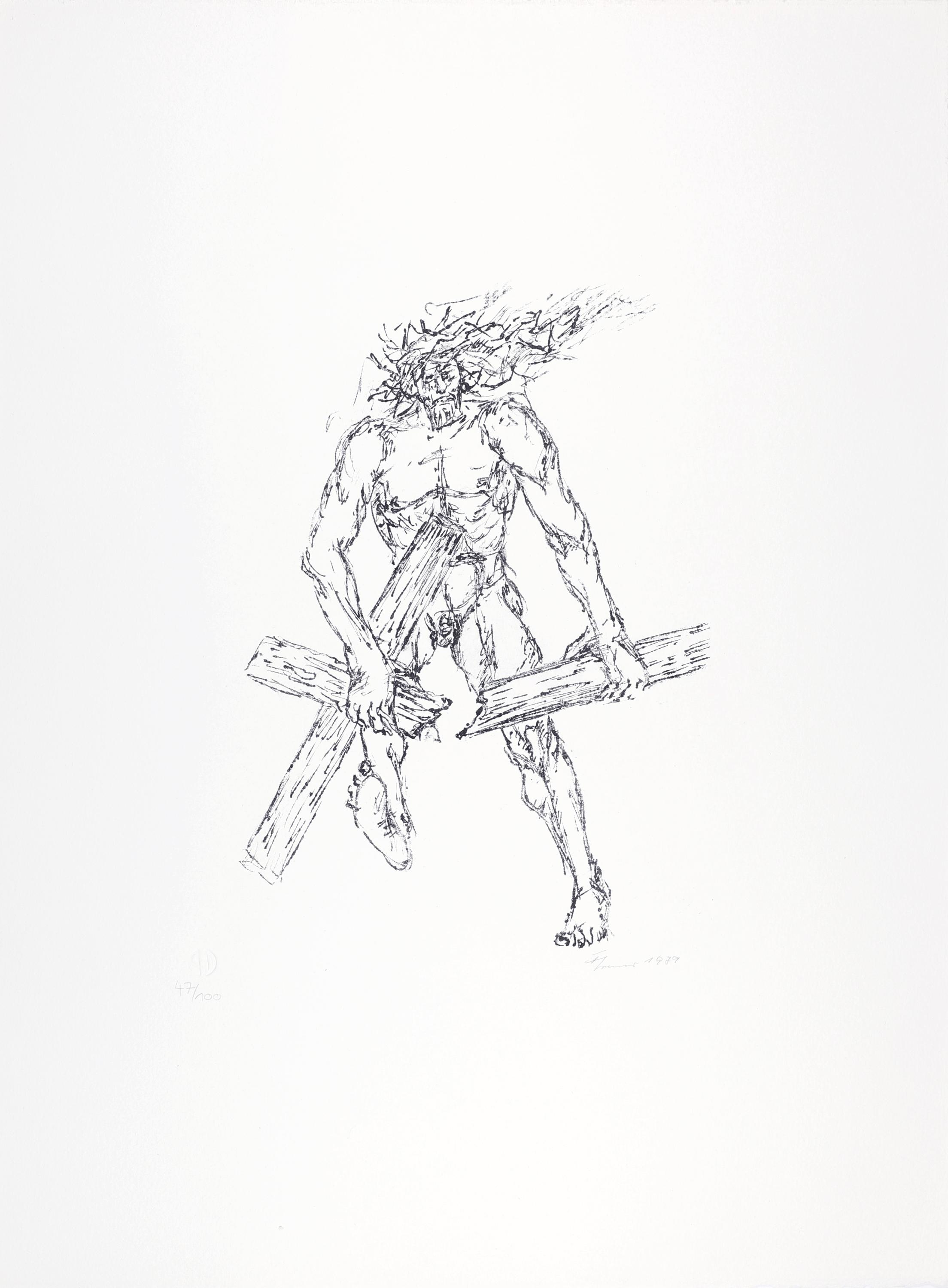 Christus zerbricht das Kreuz (frei nach Otto Pankok) (Blatt 4 der Mappe „Der Gekreuzigte“)