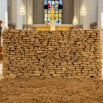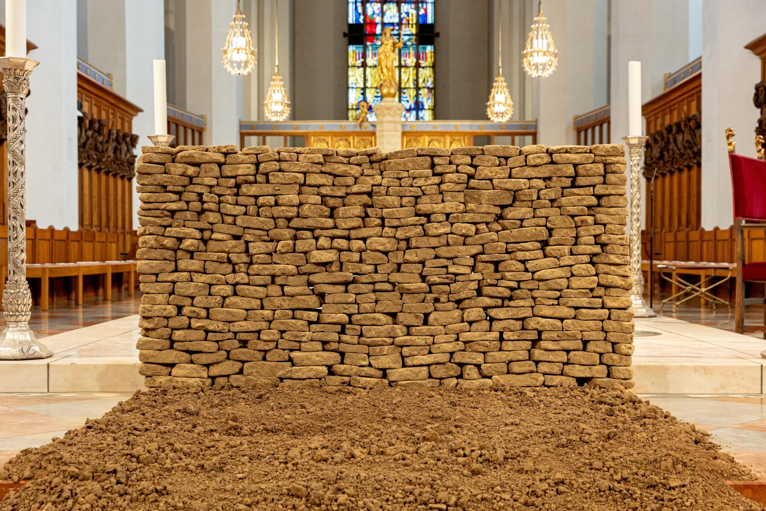 Für den Dom in München habe ich eine Erde – Installation entworfen, die ein Hindernis zum üblichen Weg zum Altar darstellt. Getrocknete Erdstücke werden übereinander zu einer Wand geschichtet, die den Alter verdeckt. Eine Wand die fest gemauert scheint, aber fragil ist. Eine Barriere, die auch den Blick zum Altar verändert. Die Installation direkt vor dem Altar führt zu einer Irritation im Raumgefüge und man ist gezwungen einen anderen Zugang zu wählen. Der Besucher muss seinen Standpunkt verlassen um den Altar zu sehen.
