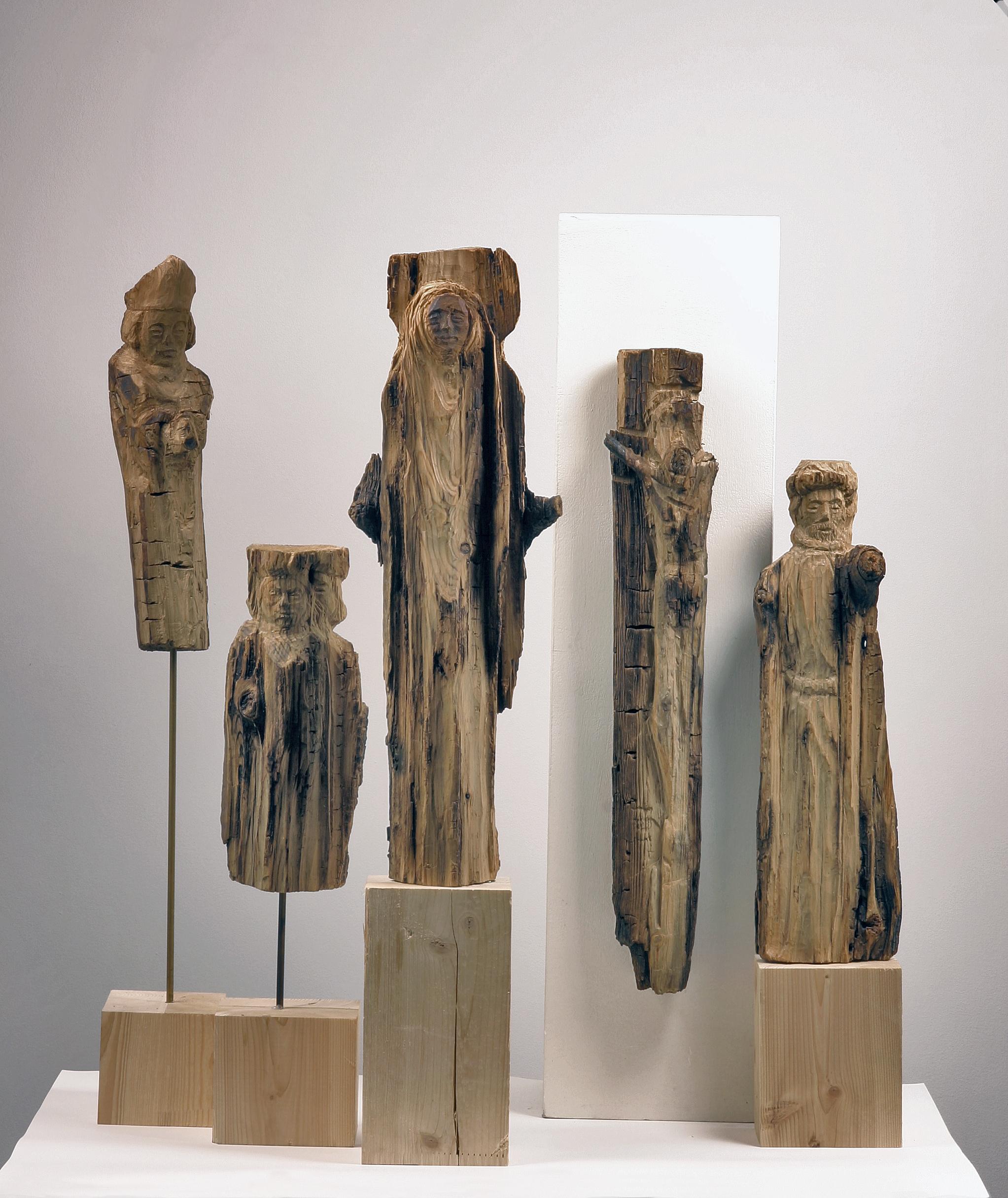 Bei Ausgrabungen am Cottbuser Altmarkt am Beginn des neuen Jahrtausends fanden Archäologen einen Knüppeldamm, eine gut erhaltene Wegbefestigung, die in den Jahren 1264/65 erbaut wurde. Das Holz wurde als nicht konservierungstauglich eingeschätzt und dementsprechend entsorgt. Der Bildhauer Hans-Georg Wagner hat geborgen, was im erdfeuchten Zustand an Holz noch stabil schien, und diese Stücke im Atelier sorgsam trocknen lassen. Anschließend unterzog er die unzerfallenen Reste einer weitergehenden archäologischen Grabung und machte sensationelle Entdeckungen in dem vor 740 Jahren geschlagenen Holz. Wagner reagiert, wie in seinen anderen Arbeiten auch, mit Behutsamkeit auf formale Angebote seines Materials und dessen besondere Geschichte. So entstanden Figuren, die, ohne direkt zu zitieren, auf das Alter des Materials und die damalige Kultur- und Skulpturtradition reagieren. Gegenwärtiges und Vergangenes verweben sich zu einem eigentümlichen Spannungsfeld, Geschichte fängt an, Geschichten zu erzählen.